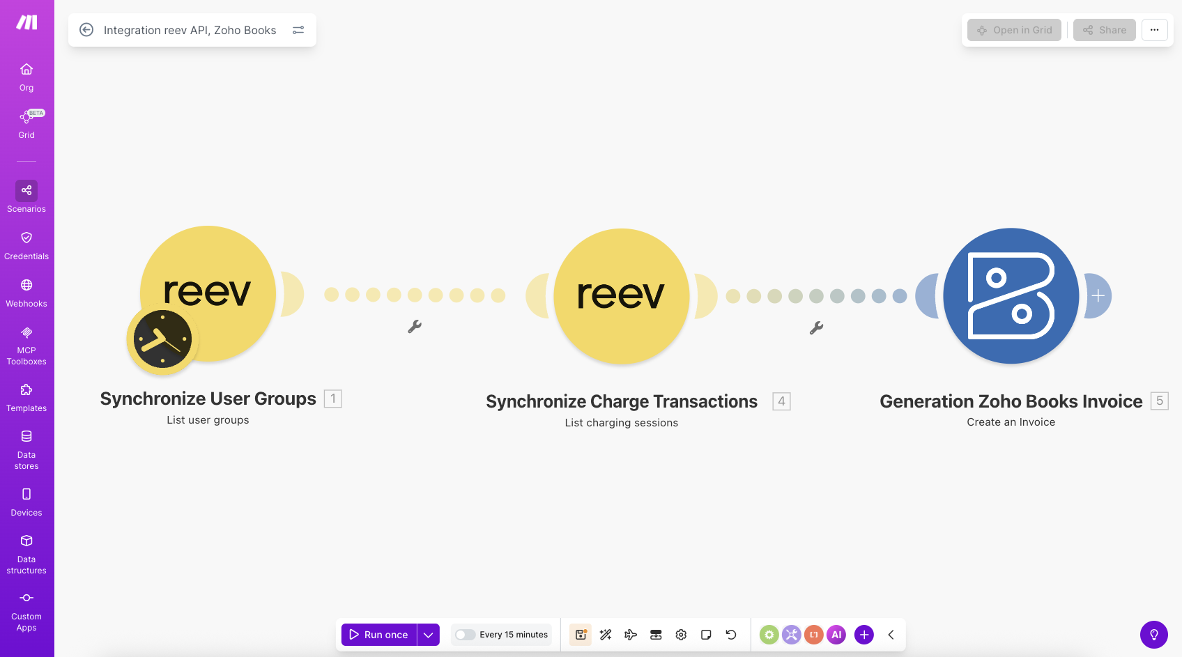 The partner built a workflow on MakeAI Workflow Automation Software & Tools — a visual automation platform that connects applications without writing code. Once a month, it pulls session data from the reev API, applies each customer’s pricing model, and pushes billing records directly into Zoho Books, linked to the correct contact.