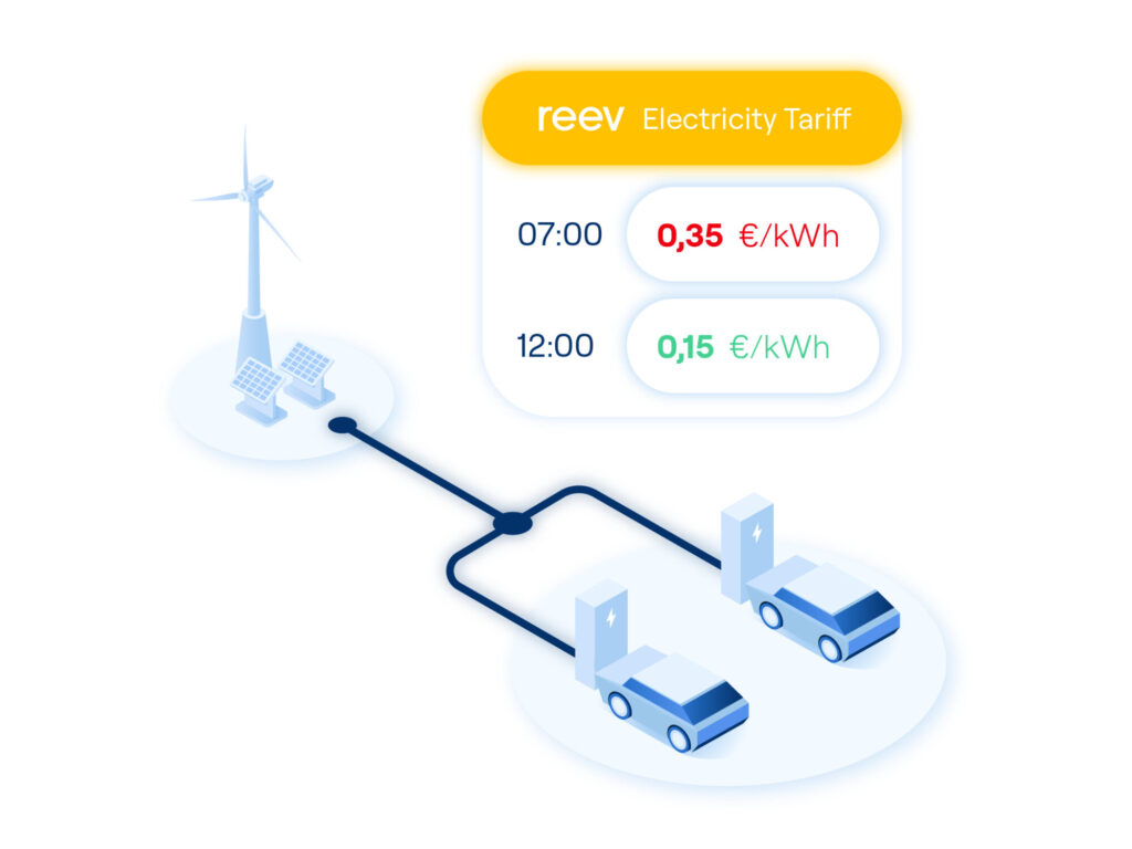 Het reev elektriciteitstarief versmelt de Europese elektriciteitsmarkt met het intelligente energiebeheer van het reev platform en dus met de laadinfrastructuren van alle reev klanten. Met behulp van prijssignalen en AI-gestuurde optimalisatiealgoritmen worden laadprocessen automatisch verschoven naar periodes waarin bijzonder veel wind- en zonne-energie wordt opgewekt. Ervan uitgaande dat een bedrijf een bestaand tarief heeft met een vaste werkprijs van 35 cent/kWh, zou dit dalen naar 25 cent/kWh met het dynamische en geoptimaliseerde reev elektriciteitstarief, terwijl tegelijkertijd de uitstoot wordt verminderd. Dit betekent dat bedrijven niet alleen kosten besparen, maar ook een directe bijdrage leveren aan de energietransitie.